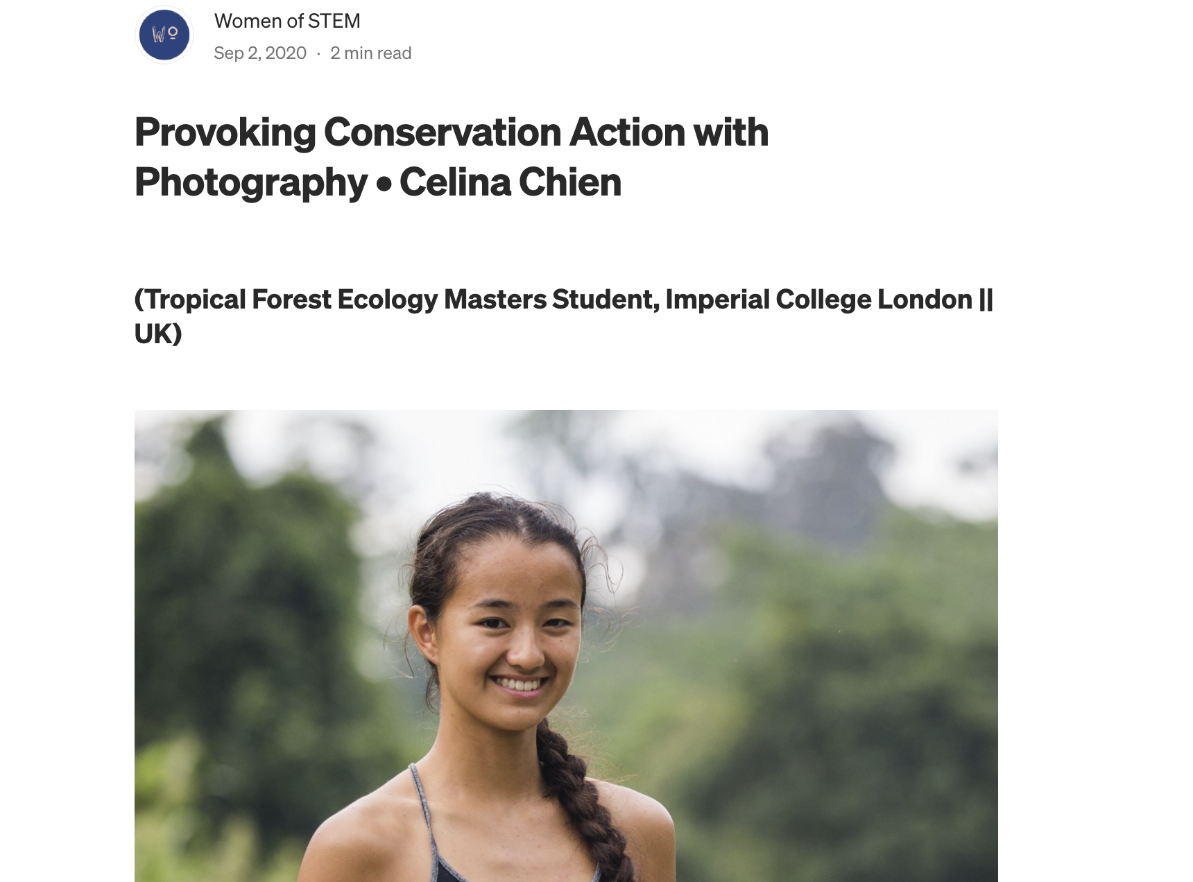 Celina was featured as a guest on the Projects for Wildlife Podcast in an episode released in titled “Celina Chien begins her conservation career using photographs to tell biological stories”.
